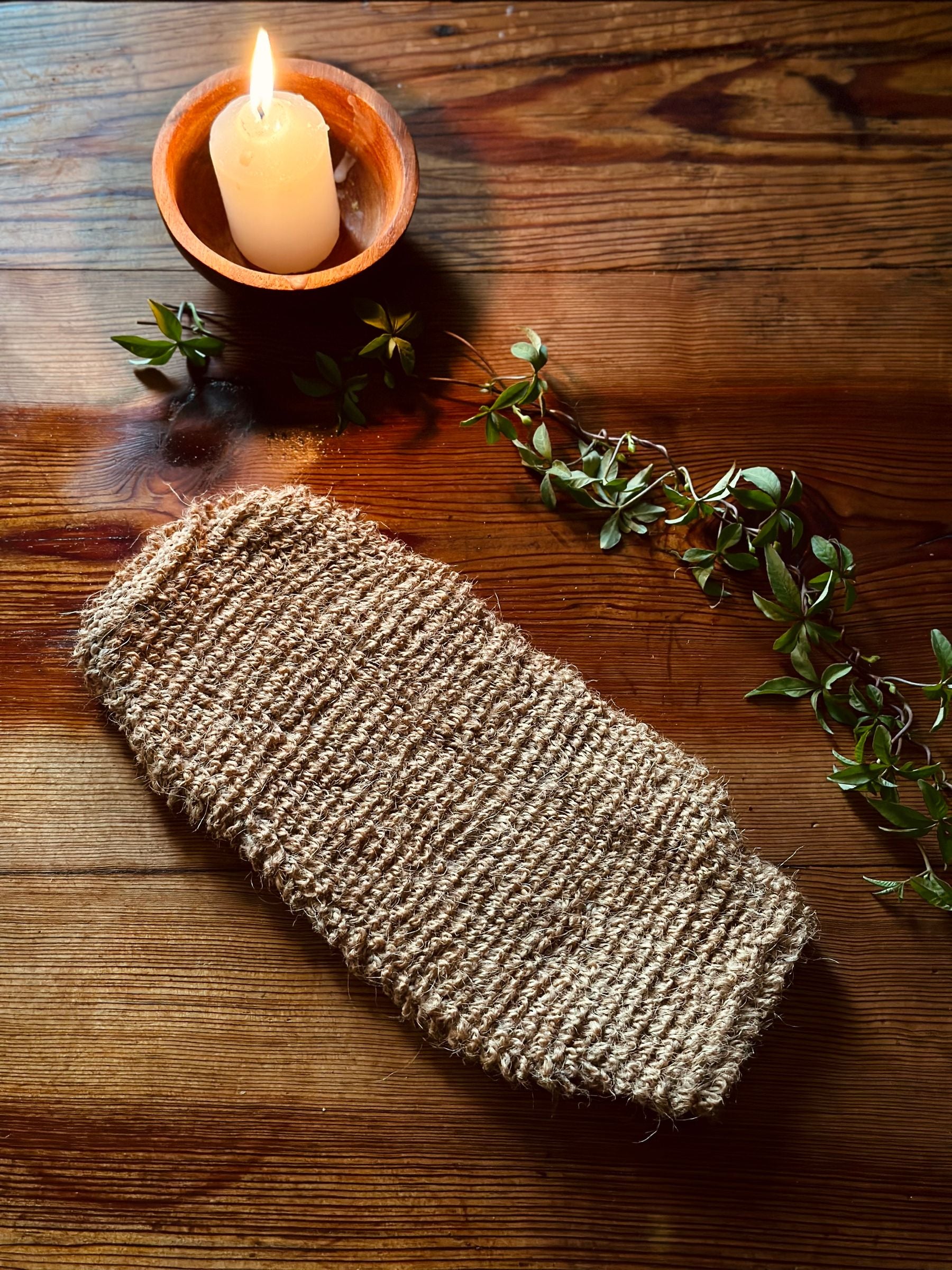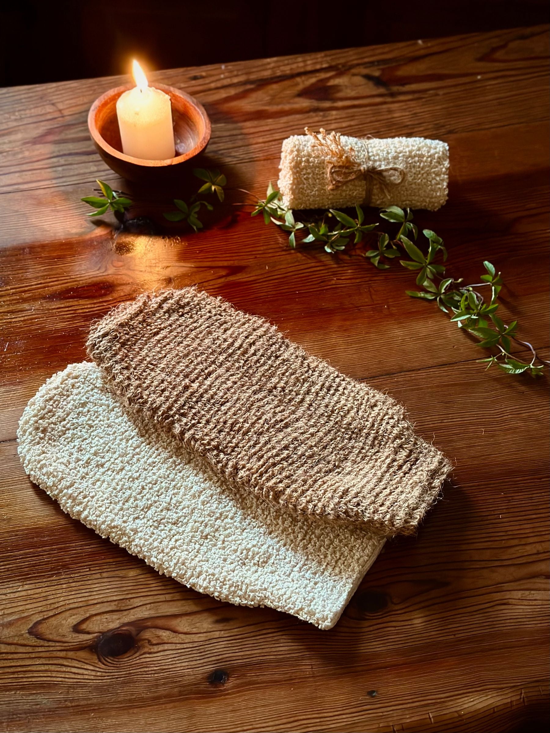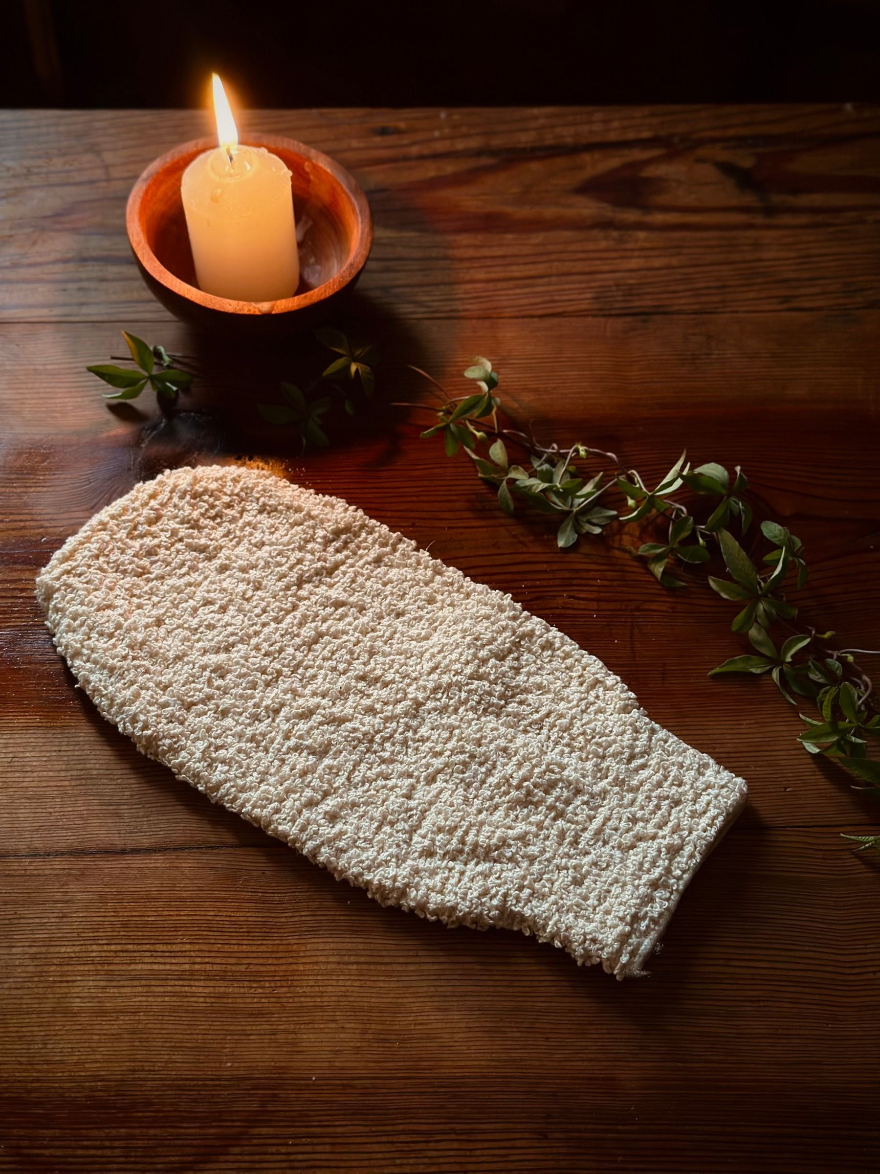 أداة أساسية في تجربة الحمام المغربي لأي امرأة. قفاز التقشير التقليدي هذا مصنوع من ألياف طبيعية، مثل الليفة أو ألياف نبات الصبار، ويستخدم لإزالة خلايا الجلد الميتة والشوائب بلطف، مما يترك البشرة ناعمة وملساء ومنتعشة.