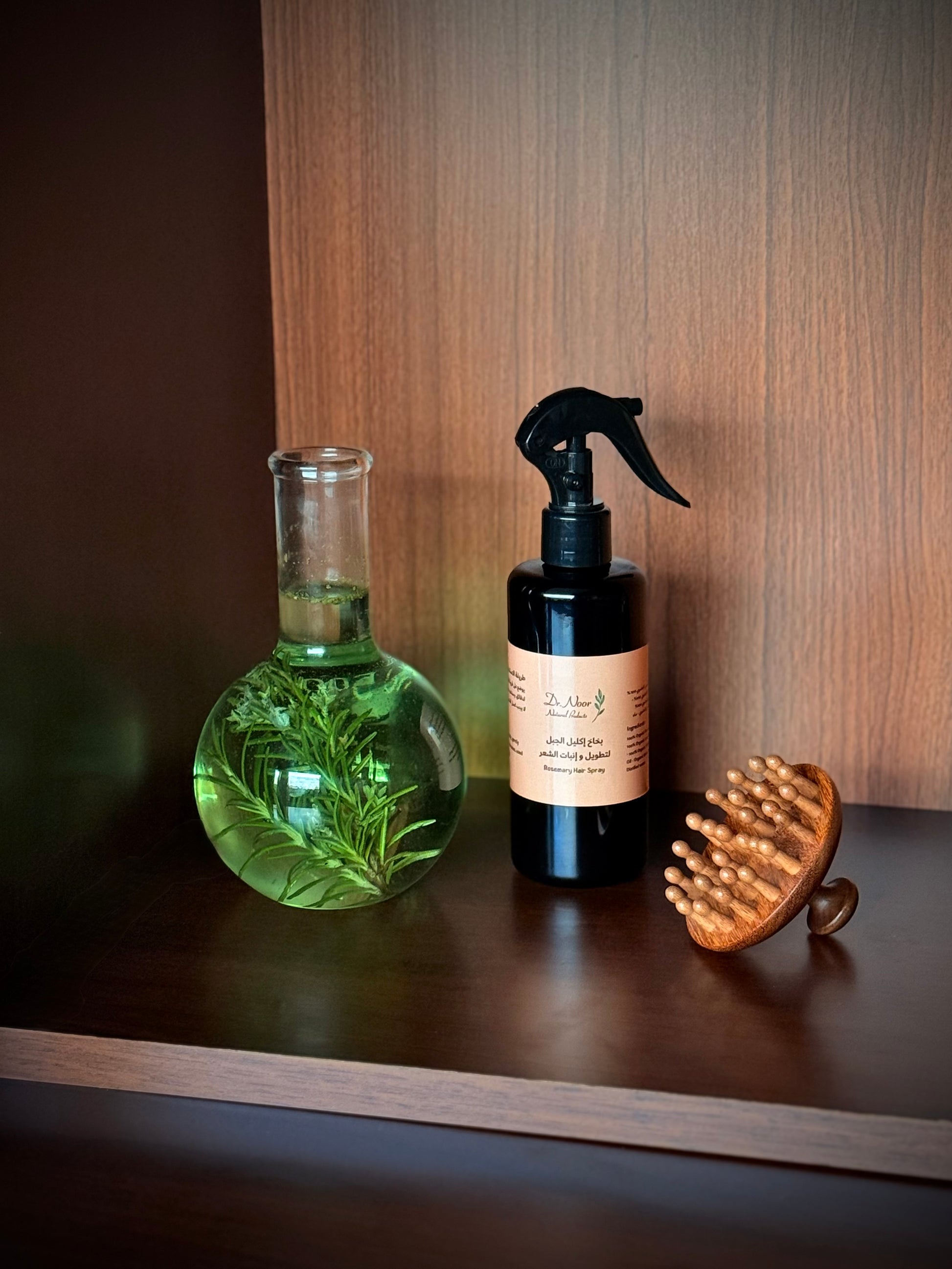أول خطوة نرش بخاخ إكليل الجبل على الجذور… هذا البخاخ فيه خلاصة مركزة من الفيتامينات اللي تعيد انبات الشعر و تزيد من سرعة طوله ، ما يحتاج تغسلينه.